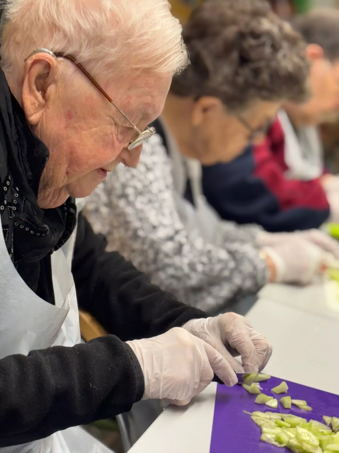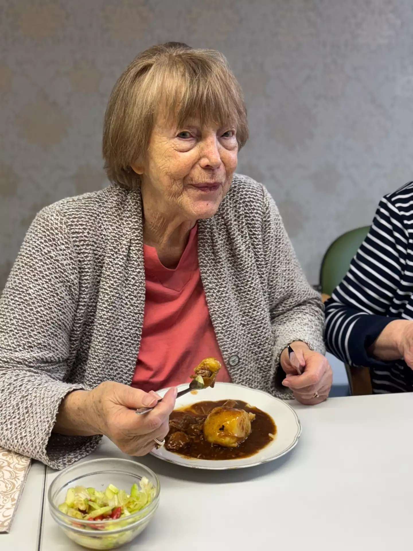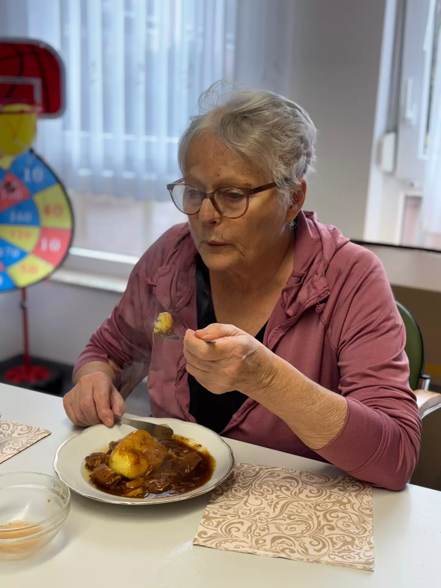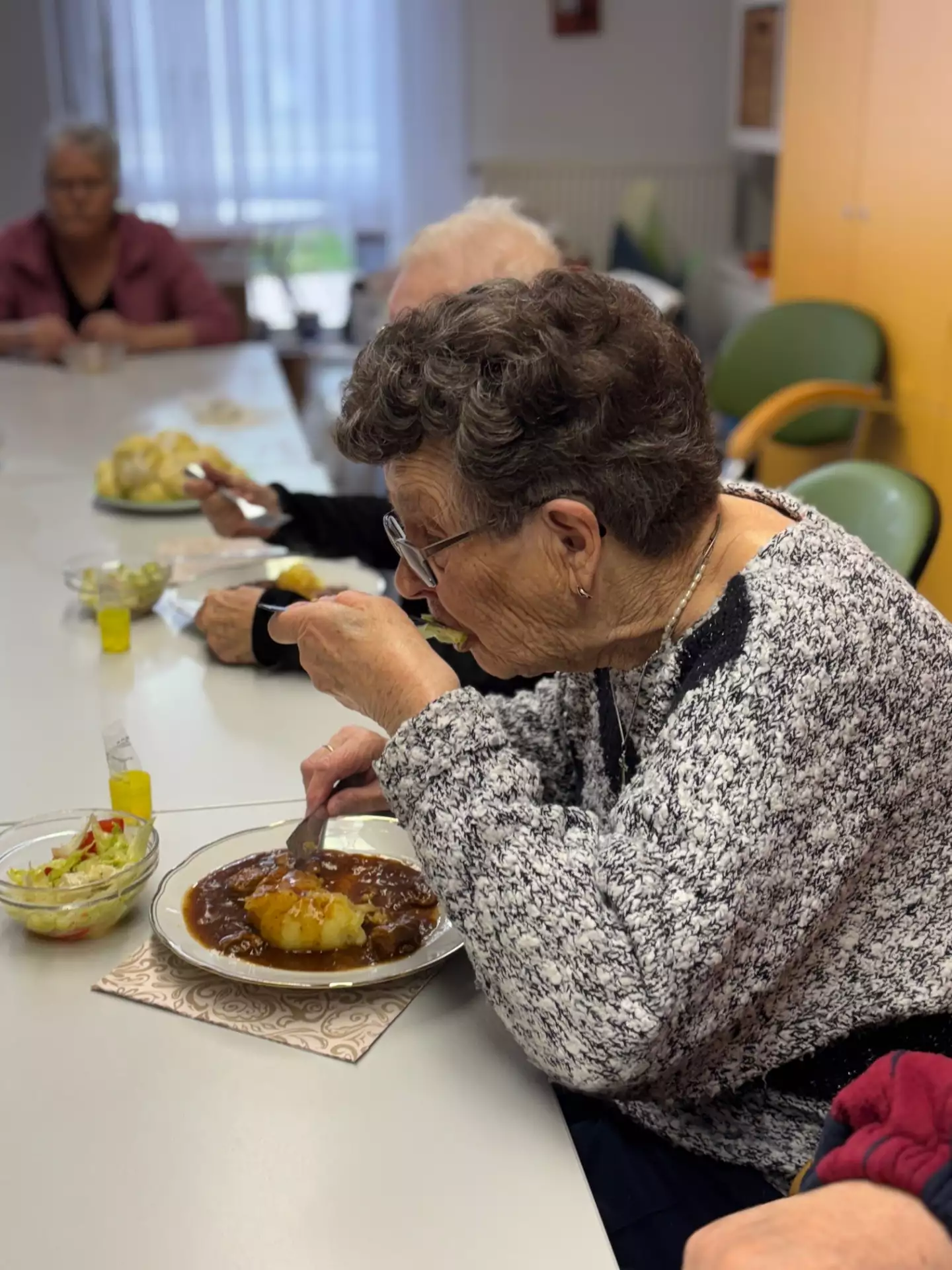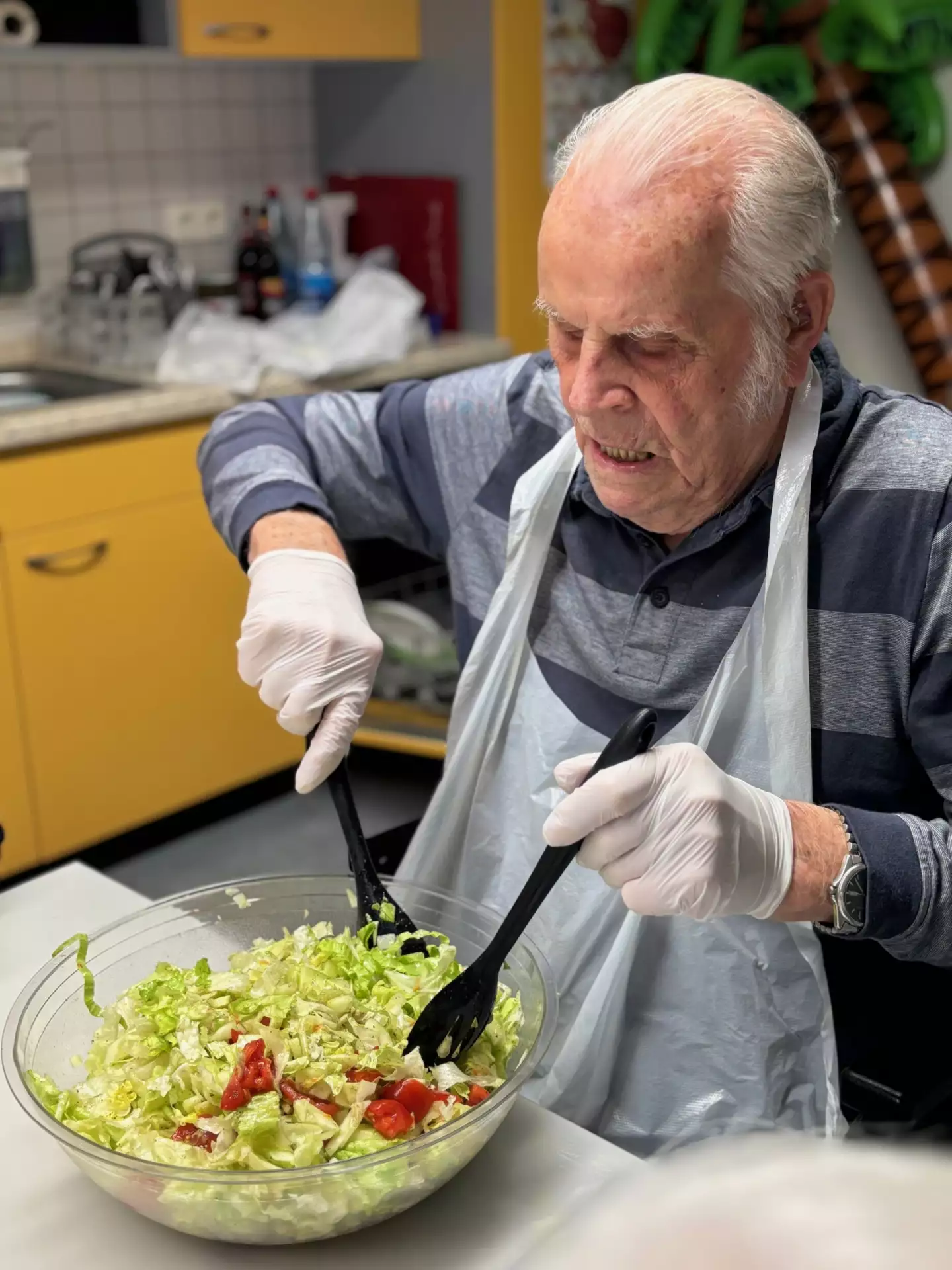 Rosi (Mitarbeiterin der sozialen Betreuung) lud unsere Bewohnerinnen und Bewohner zu Kochen ein. Man wünschte sich ein deftiges Gulasch mit Klößen und Salat. Jeder Platz im Kochstudio war besetzt, da alle bei diesem Highlight dabei sein wollten. Es wurde geschnippelt, gerührt und angebraten, was das Zeug hält, und am Ende kam ein Ergebnis der Extraklasse heraus.