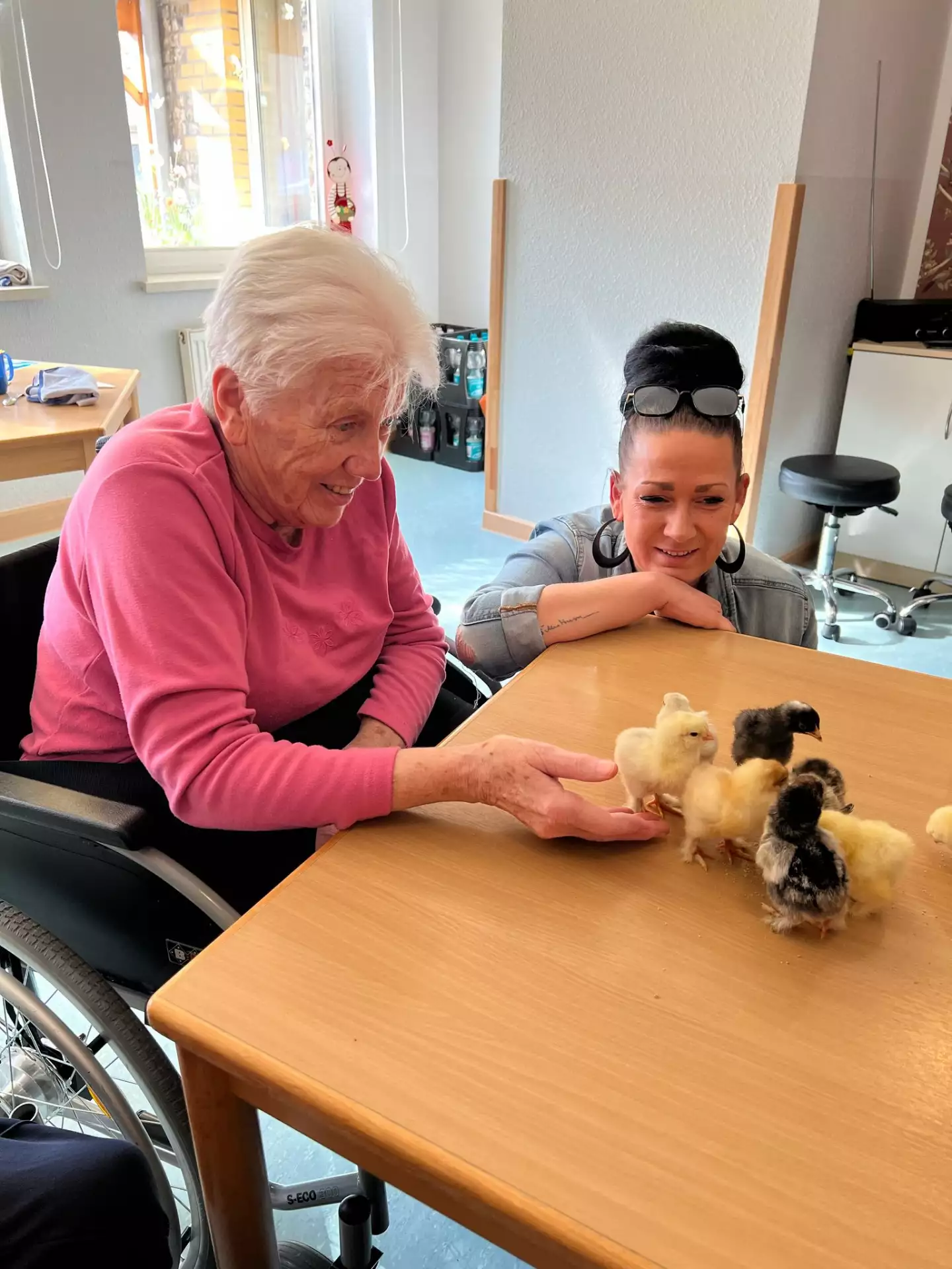 Es ist immer wieder faszinierend zu beobachten, wie gerade auch unsere dementen Bewohner auf Tierbesuche reagieren und wie andersrum auch Tiere auf demente Bewohner reagieren - sie werden ruhig, schlafen sogar ein in den Händen der Bewohner. (natürlich auch bei den Mitarbeitern)