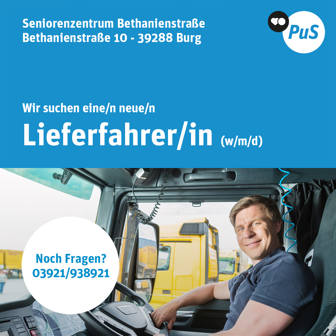 Für unser Seniorenzentrum in der Bethanienstraße in Burg suchen wir ab sofort eine/n neue/n Auslieferungsfahrer/in (w/m/d) für 43,20 Stunden im Monat.