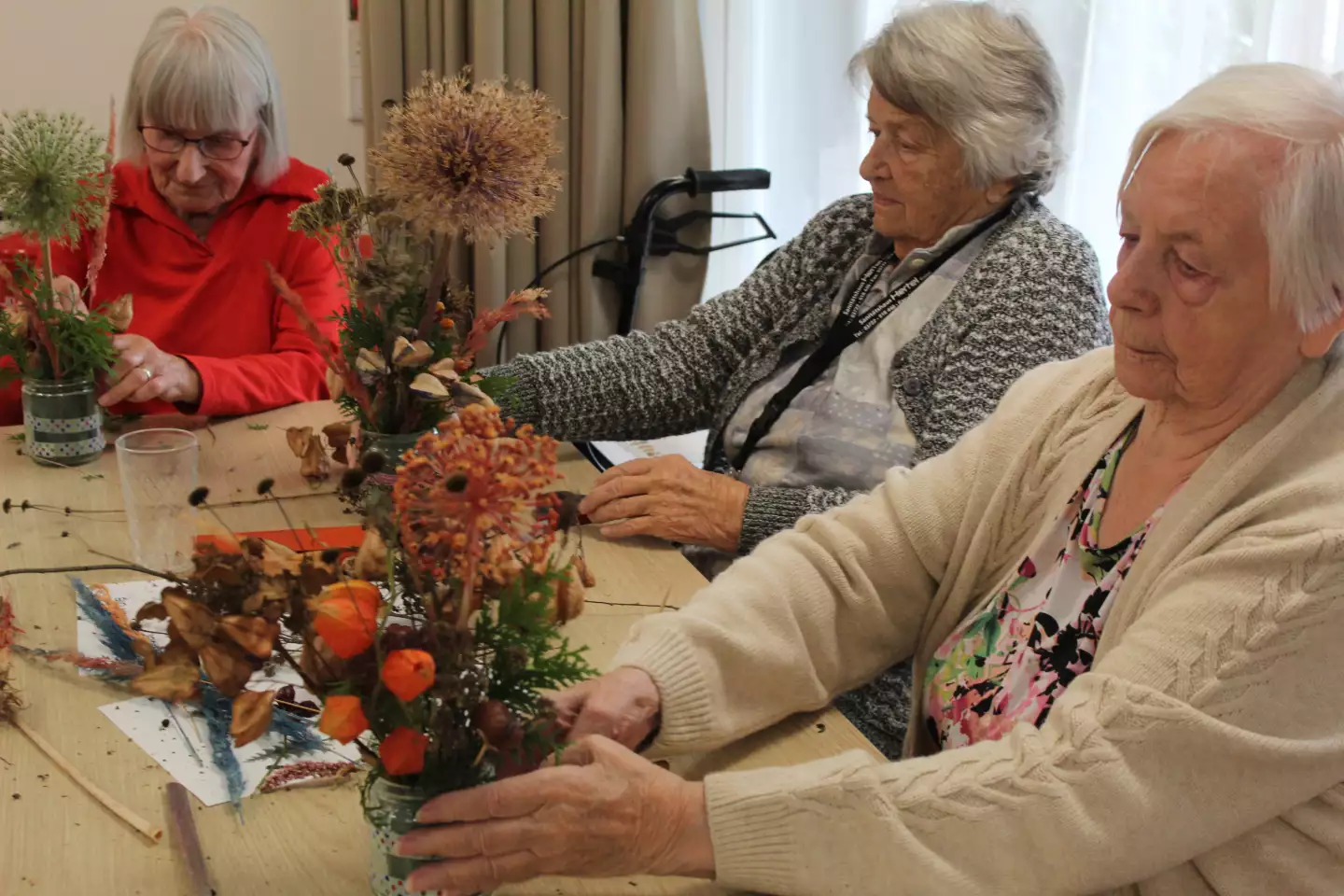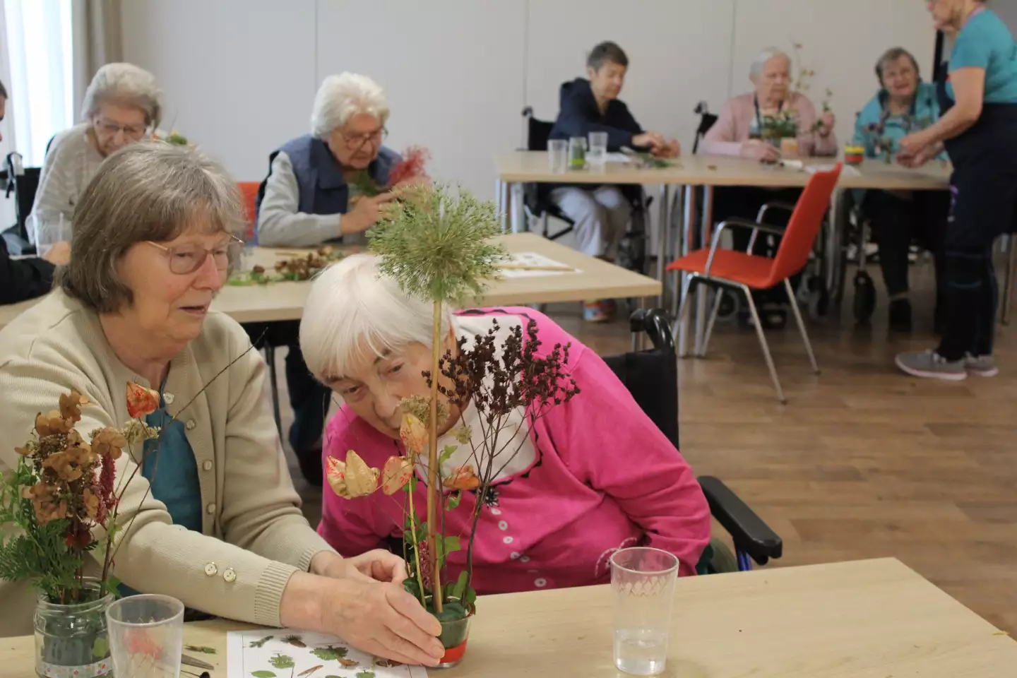 Auch eine alte Schiefertafel freute sich nach vielen Jahrzehnten über ihre Wiederverwendung. Die Übungen mit altdeutscher Schrift sorgten für regen Austausch unter den Bewohnern. Besonders stolz waren die „Schüler der Oberprima“ auf ihre Herbstgestecke, welche sie im Fach „Werken“ angefertigt haben. Die Gestecke haben nun einen schönen Platz in ihren Zimmern gefunden.
