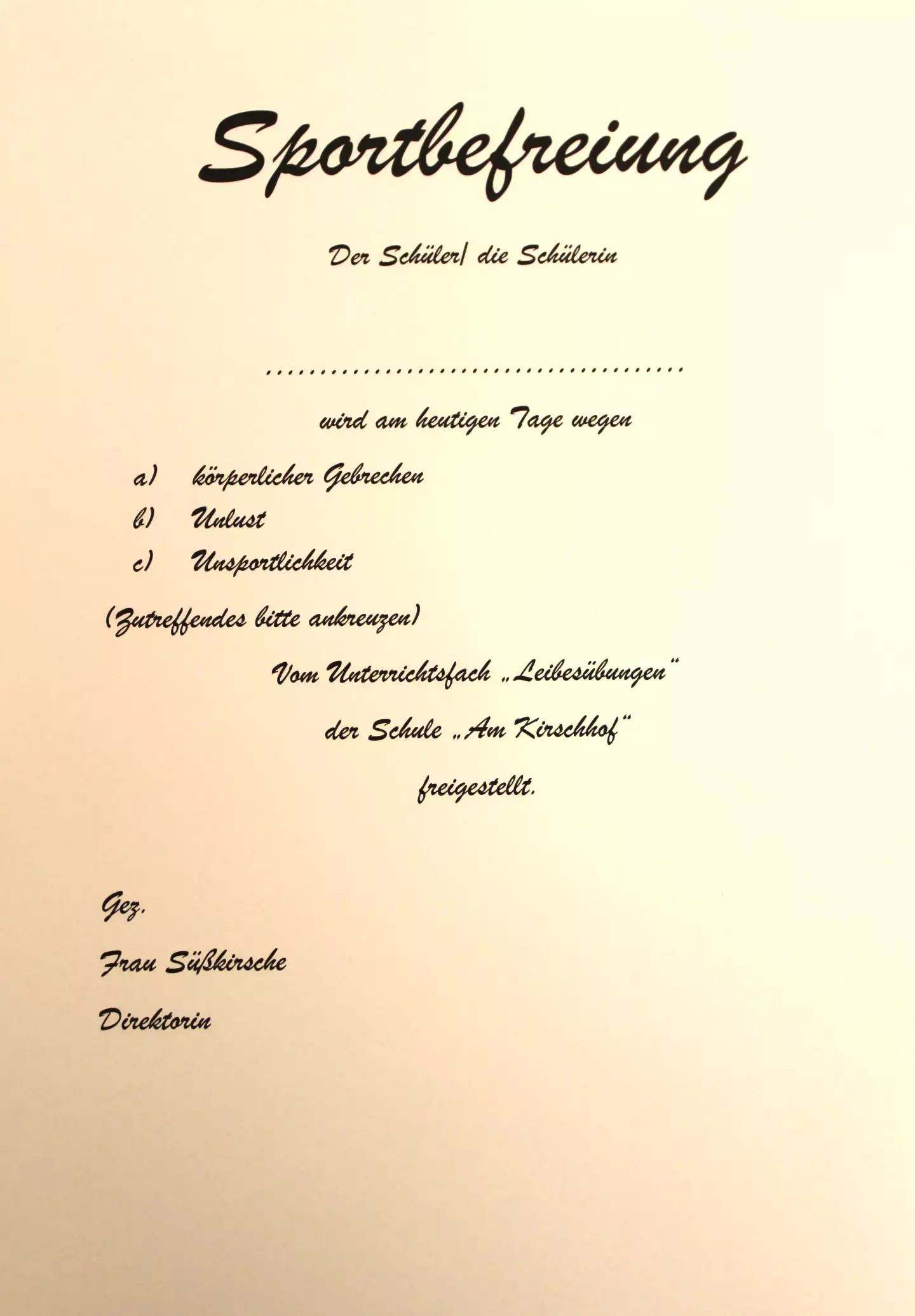 Die Mädels vom Sozialen Dienst schlüpften in die Rolle der Lehrerschaft und sorgten für einen abwechslungsreichen „Unterricht“ mit viel Witz und guter Laune. Manch ein Bewohner staunte nicht schlecht über die Aushändigung einer „Sportbefreiung“, wenn er sich „nicht so pässlich“ für die Teilnahme an den Leibesübungen fühlte.