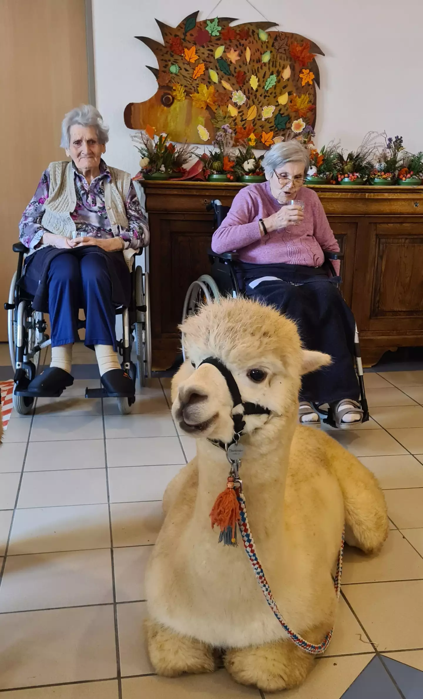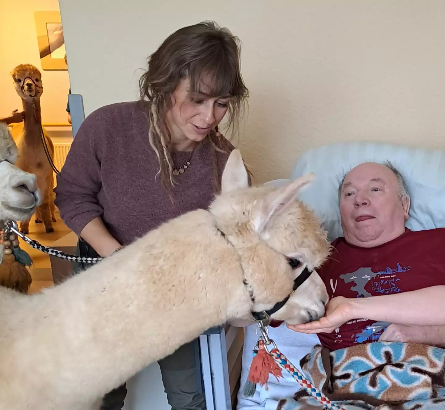 Der Besuch der Alpakas sorgte ebenfalls für große Freude. Da das Wetter schlecht war, kamen die Tiere diesmal direkt ins Haus und haben einige Bewohner sogar am Bett besucht.