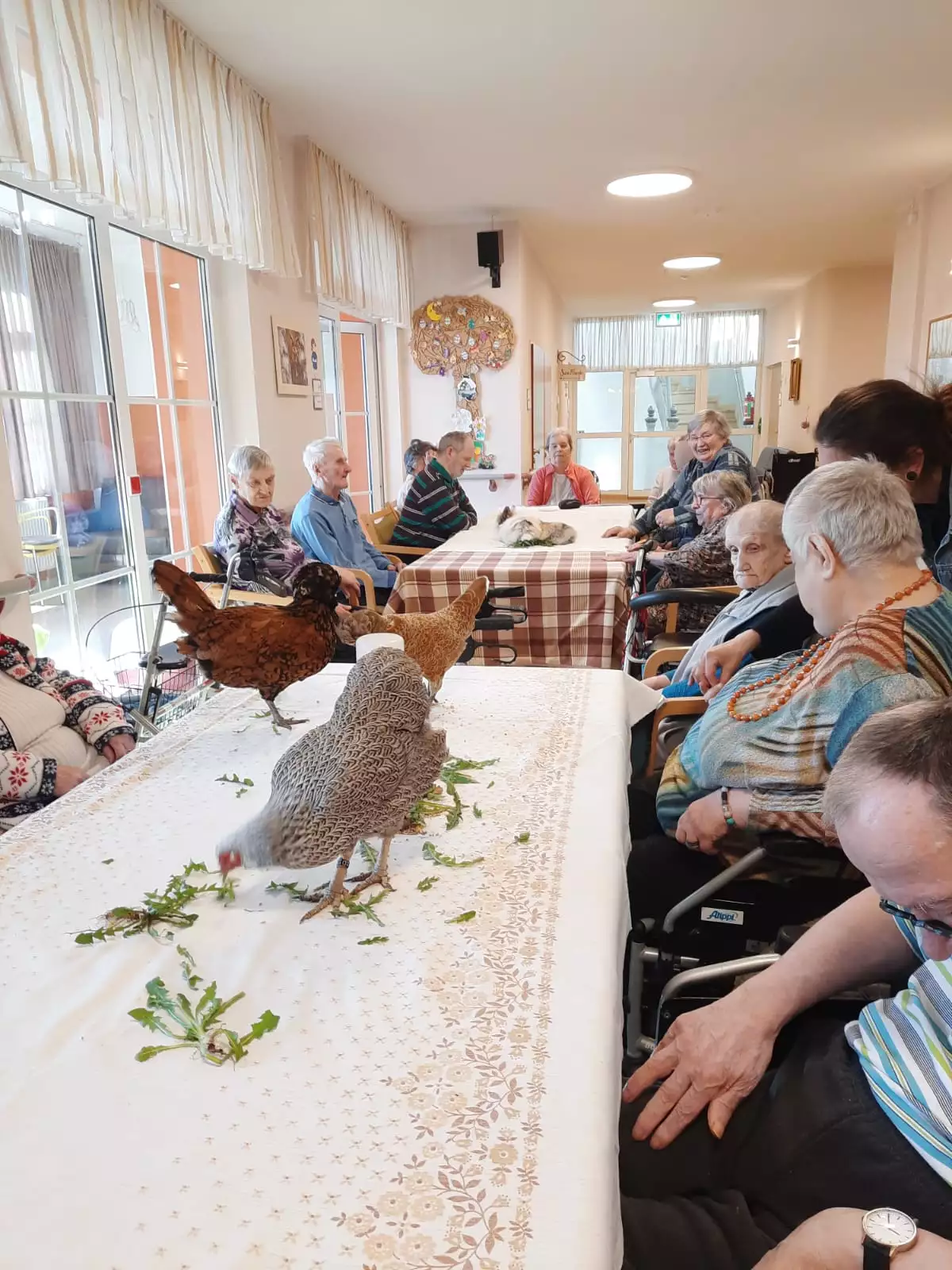 Besonders das Huhn Adelheit zog mit ihrem prachtvollen Gefieder alle Blicke auf sich und wurde von vielen bewundert. Hase Franz hingegen eroberte mit seinem unglaublich weichen Fell im Sturm die Herzen der Bewohnerinnen und Bewohner – viele Hände streichelten ihn liebevoll, und man konnte sehen, wie gut diese Nähe tat.