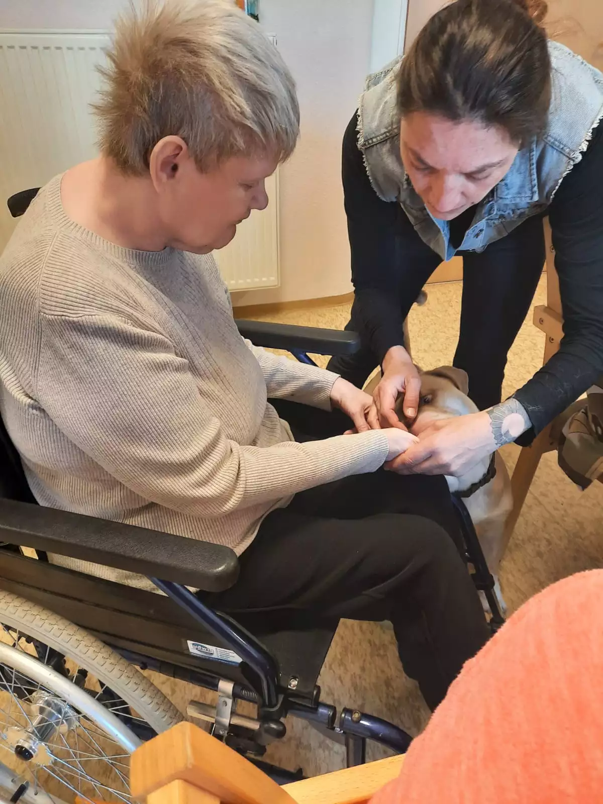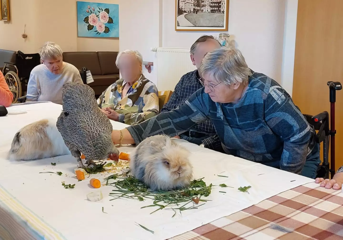 Der Besuch unserer Tierpension war für alle Bewohnerinnen und Bewohner ein ganz besonderes Erlebnis. Schon beim Eintreffen der Tiere war die Freude groß, und schnell erfüllten fröhliche Stimmen und strahlende Gesichter den Raum. Die Hasen, die Hühner und natürlich auch der Hund Helmut sorgten für viele schöne und berührende Momente.
