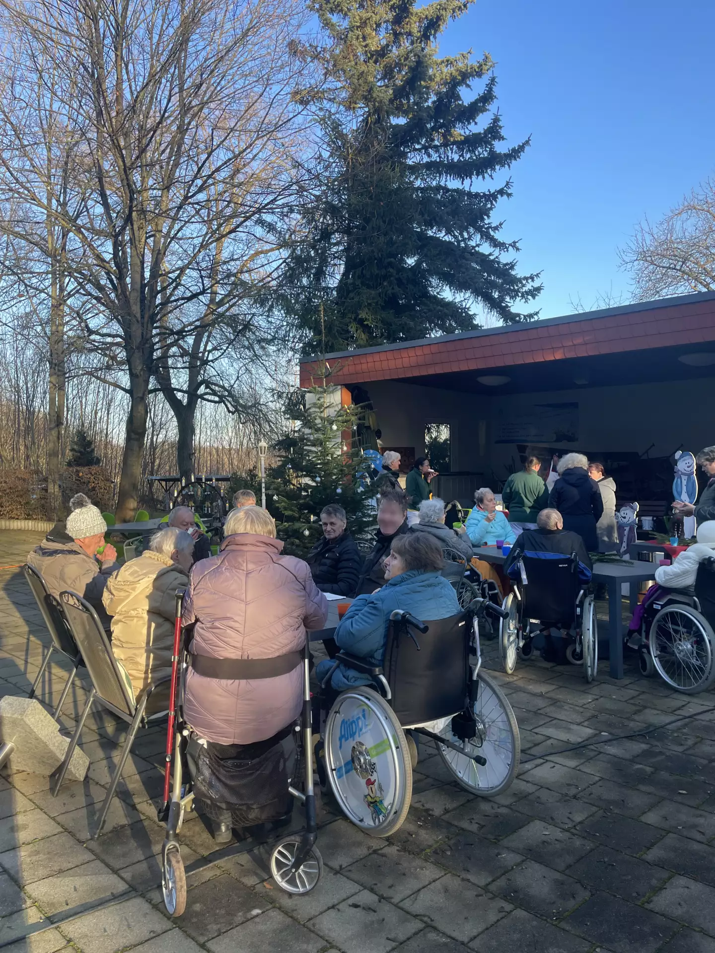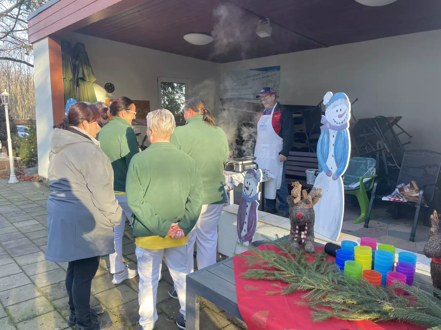 Eine weihnachtliche Waffelbäckerei auf der herrlich geschmückten Terrasse war ein echtes Highlight der Adventszeit. Der „Waffel-Klaus“ sorgte mit seinen frisch gebackenen Waffeln nicht nur für einen verführerischen Duft, sondern auch für strahlende Gesichter – schließlich weiß jeder: Gegen eine warme Waffel hat selbst der Winter keine Chance. Bei leckerem Punsch und stimmungsvoller Weihnachtsmusik entstand eine gemütliche Atmosphäre, in der man gern ein wenig länger verweilte. Natürlich ließen es sich auch die Mitarbeiterinnen und Mitarbeiter des Hauses nicht nehmen, sich eine frisch gebackene Waffel abzuholen – Qualitätskontrolle muss schließlich sein.
