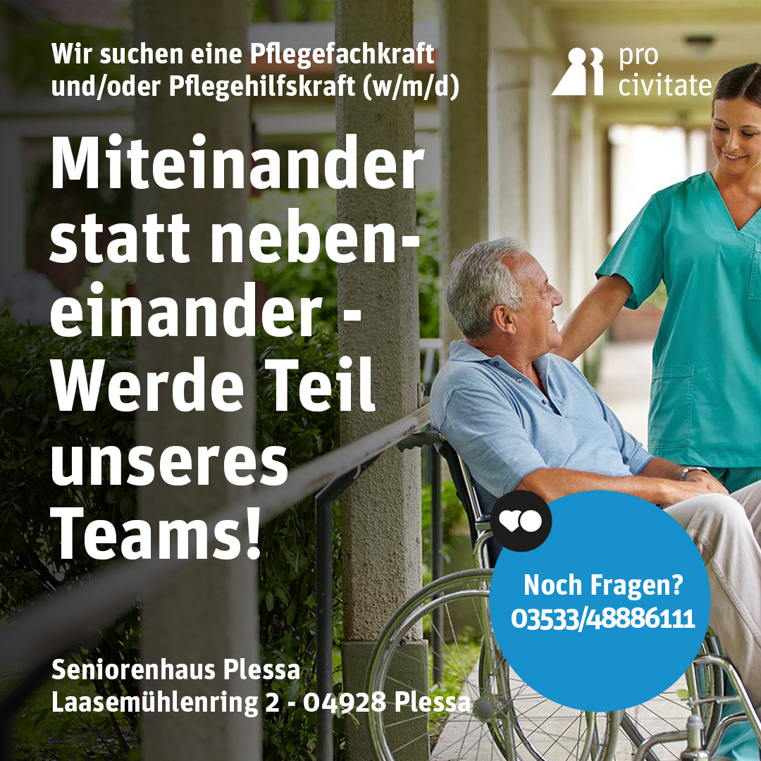 Dann freuen wir uns auf Deine Bewerbung! Sende uns Deine Unterlagen per E-Mail an hl.plessaprocivitate.de oder kontaktiere uns direkt unter 03533.48886111.
